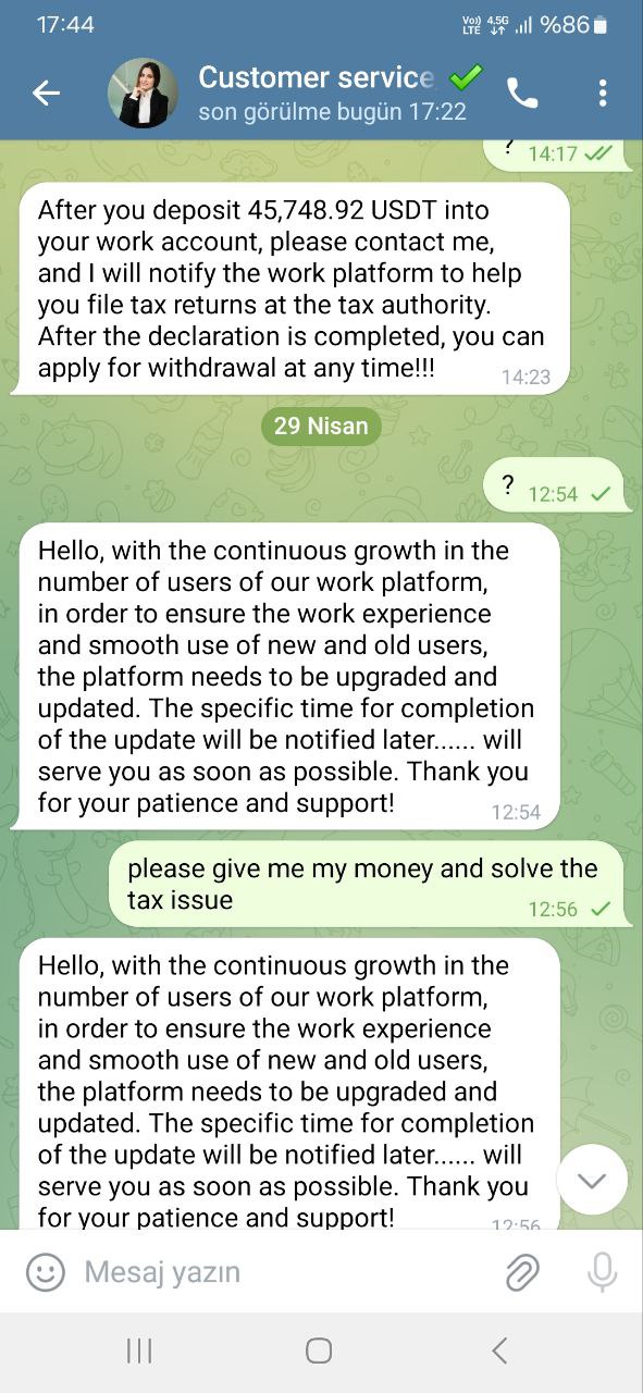 I saw post Amazon task mall online jobs and apply on FB and redirected to WhatsApp. Isabella who recruit me and advice to register. After registration she teach how to do task. Recharge 14 and first for task .after two task again task came with difference 61 and . When I ask she told you will get back this amount with your commission at end of task. She advised to complete 10 task and advised to contact service manager Alina .